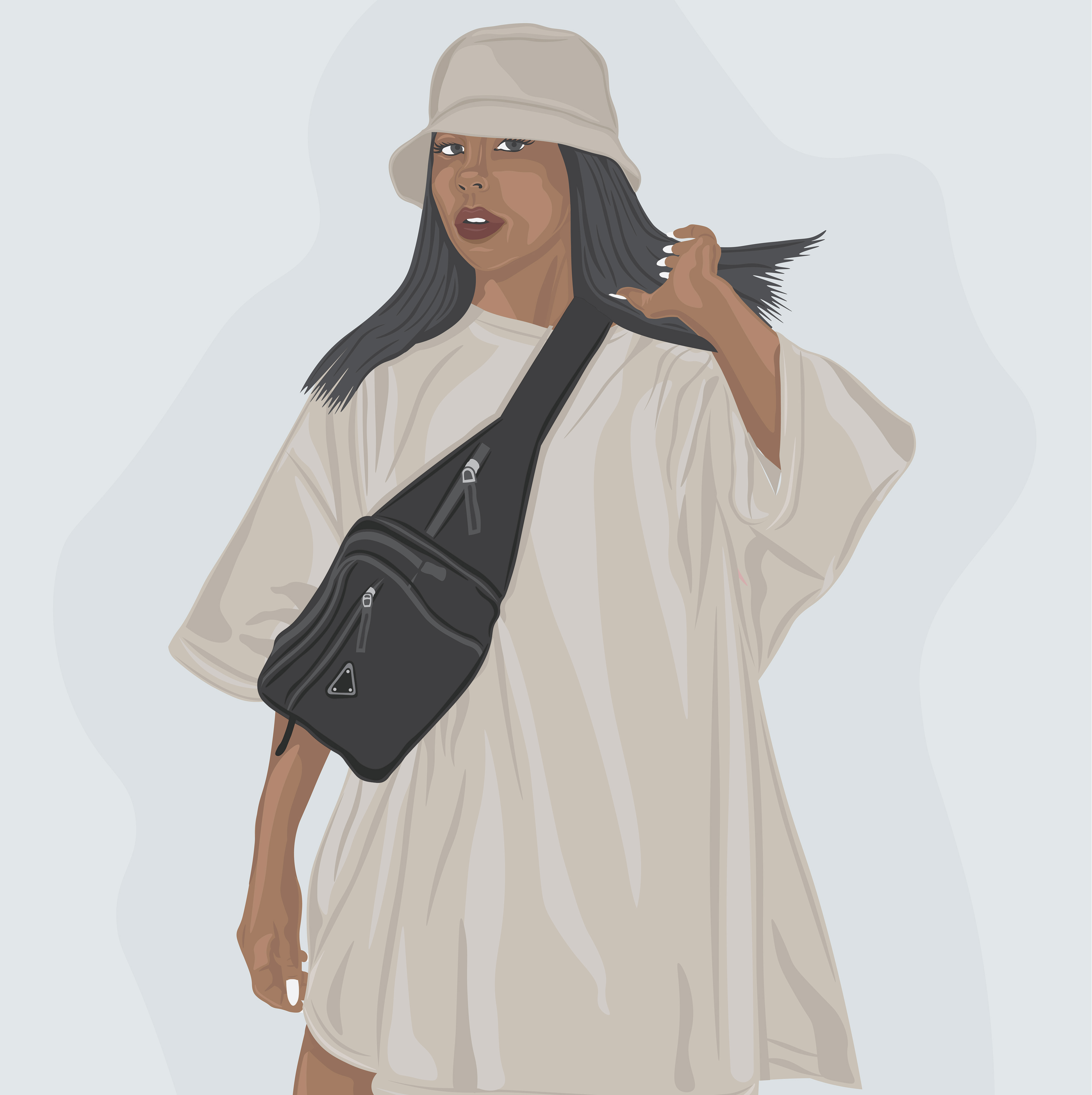 Illustration of @missjoslin wearing an oversized t-shirt, bucket hat, and Prada shoulder bag