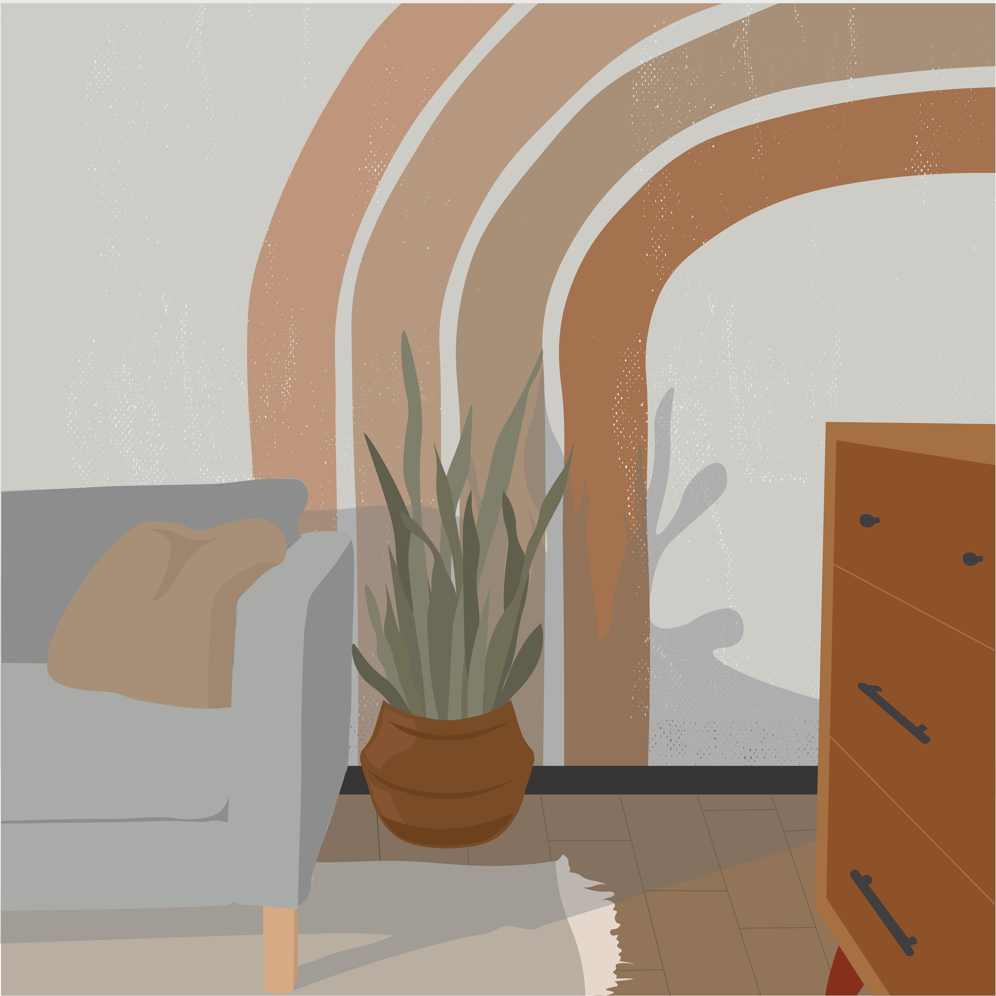 Illustration of cozy living room with gray couch, plant, and rainbow paint on wall