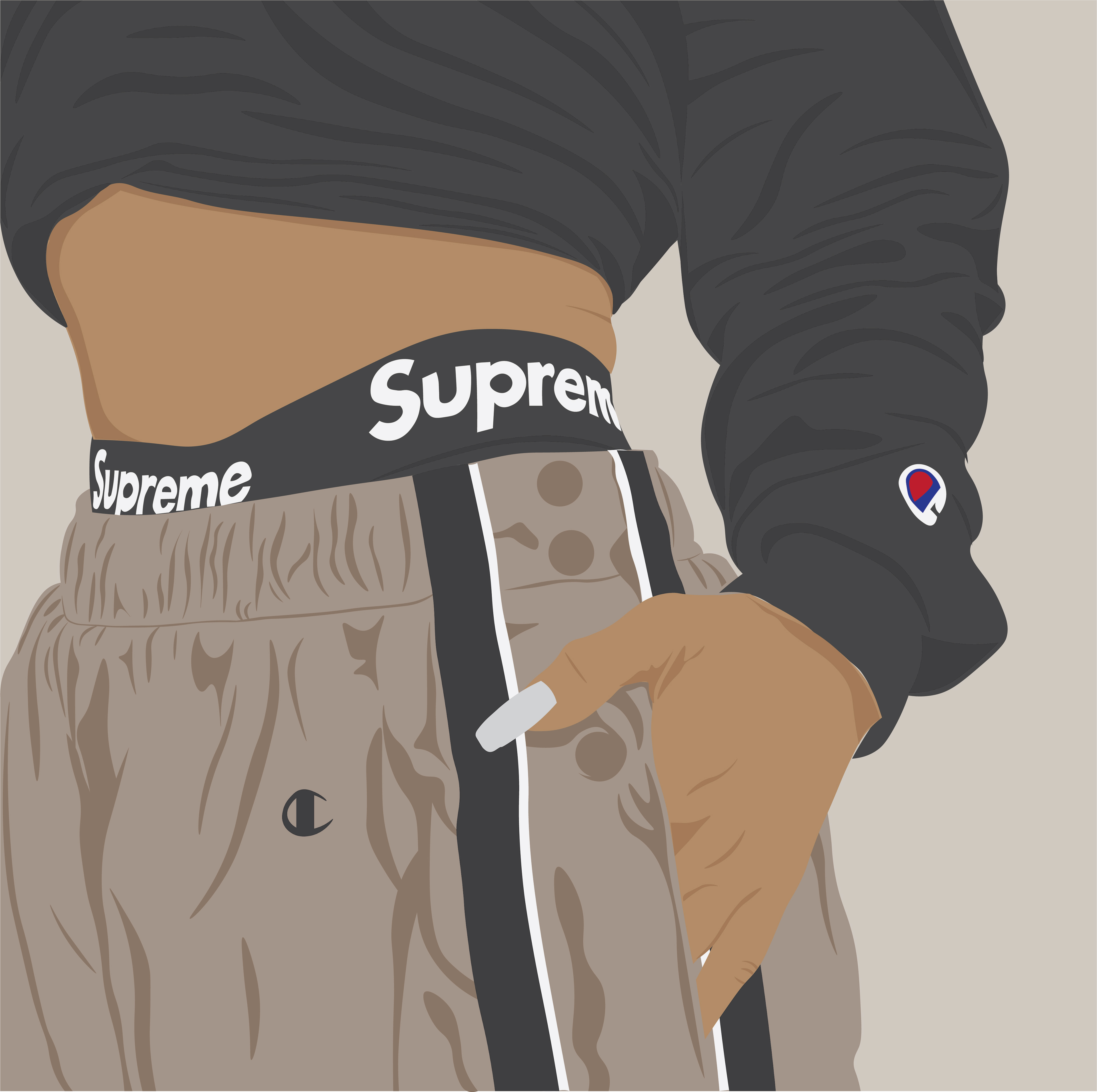 Illustration of girl in Supreme boxers and Champion hoodie/sweats