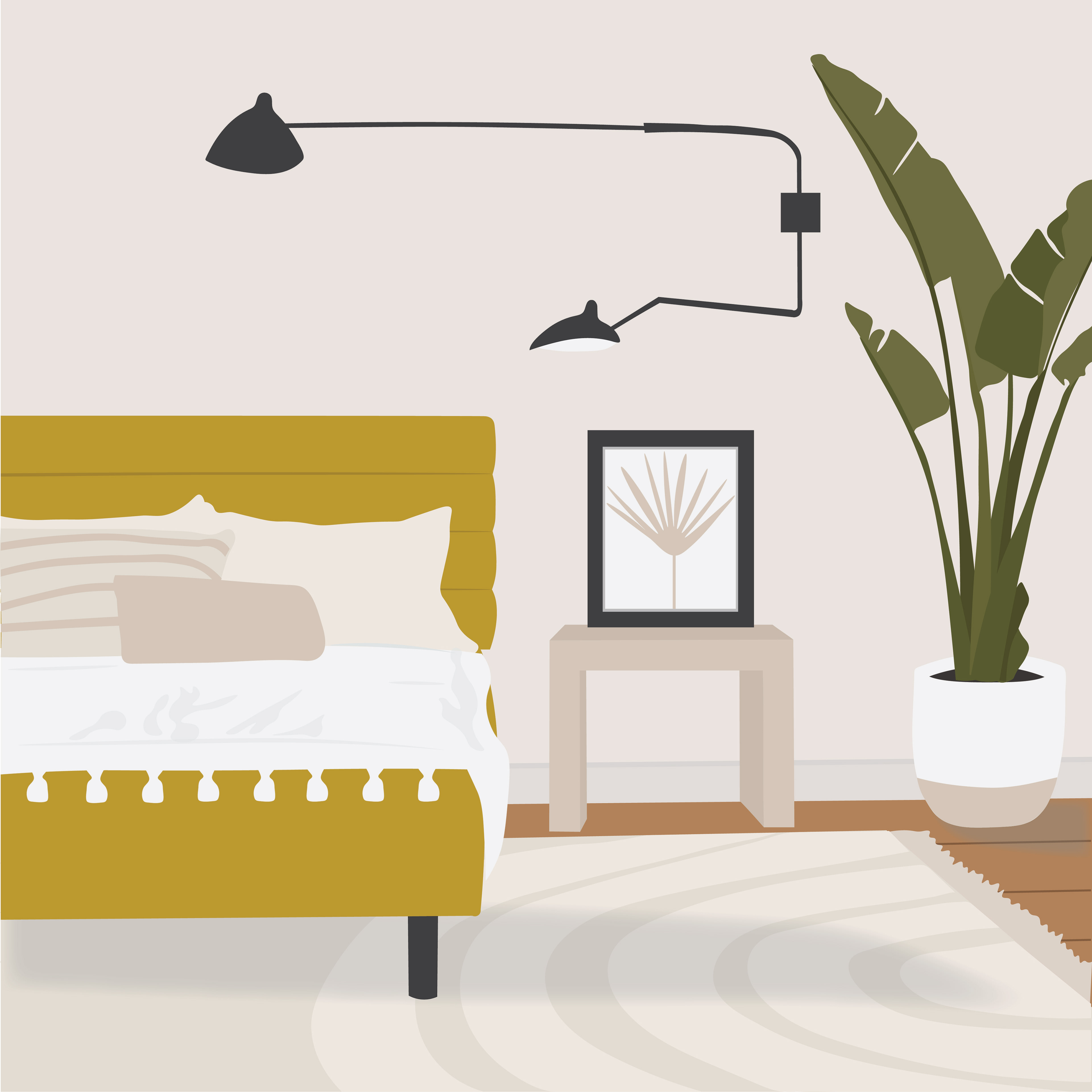 Illustration of aesthetic well-designed bedroom with plant and rug